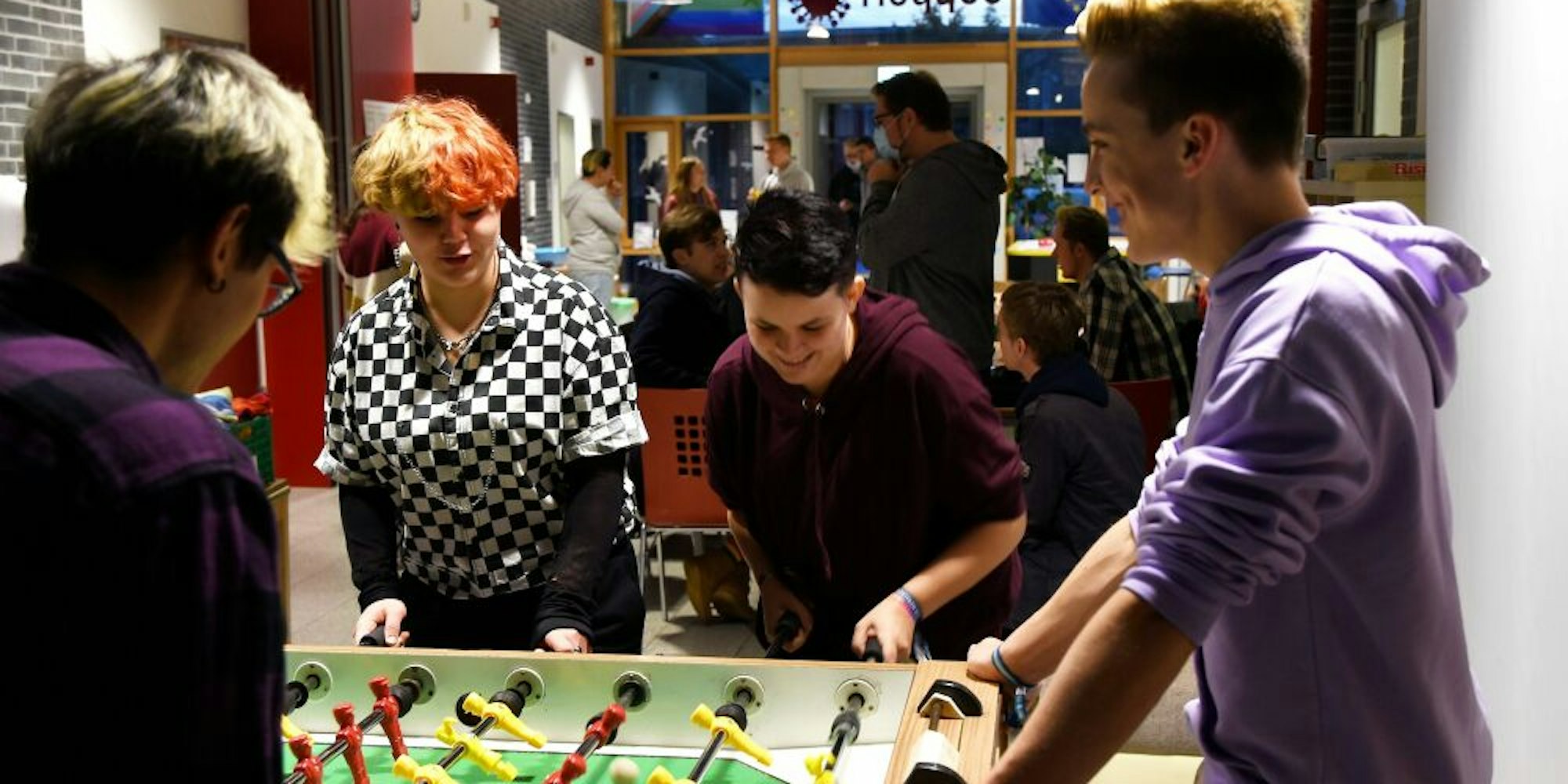 Jo (v. r.), Max und Moritz kickern im neuen Jugendtreff in Mülheim.