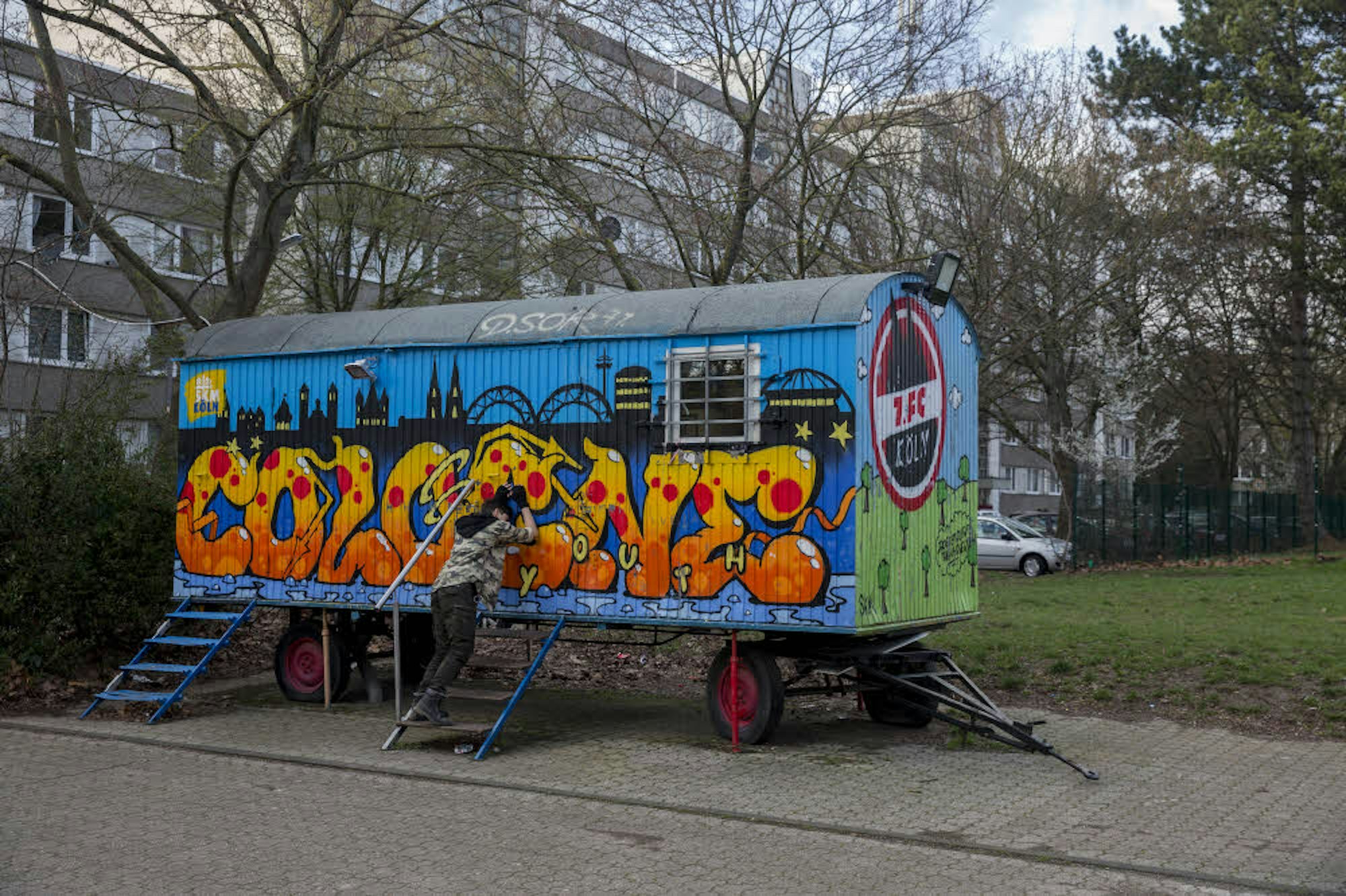 Der kunterbunte Bauwagen des Sozialdienstes Katholischer Männer (SKM) zum Beispiel bringt nicht nur optisch Farbe in den Alltag der Jugendlichen. Seit 2010 ist er ein beliebter Ort der Begegnung inmitten der Siedlung – um die Freizeit sinnvoll zu gestalten. Gemeinsam mit SKM-Mitarbeiterin Aysun Tokgözoglu zu kochen, spielen, quatschen und im Internet zu surfen – oder unterstützt zu werden, wenn es zu Hause oder in der Schule einmal knirscht. Neben dem Bauwagen gibt eine Kindergruppe des Vereins „Kindernöte“. Die „Roggendorfer Rocker“ treffen sich ein Mal pro Woche zum Lernen und Spielen auf der Straße.