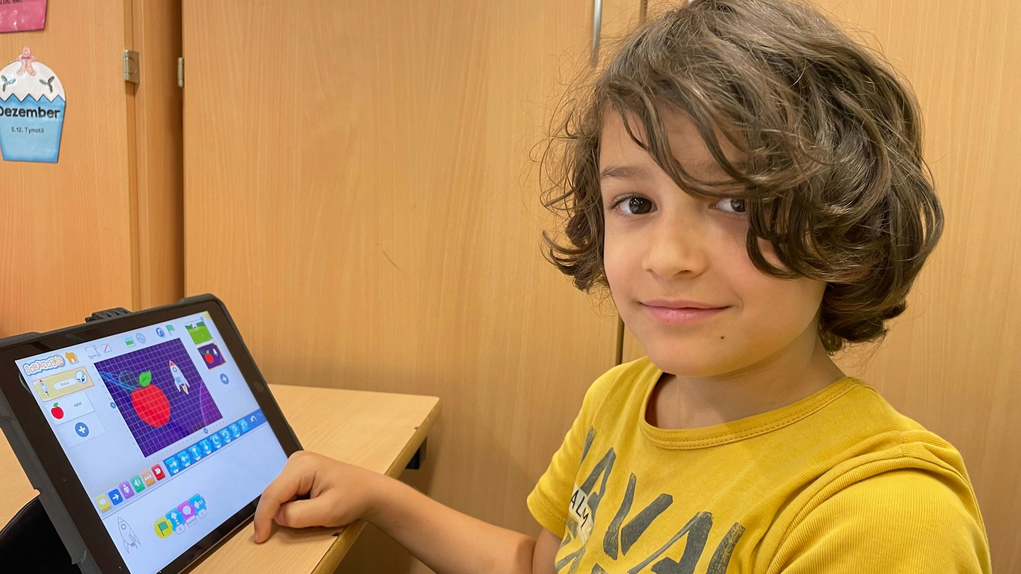 Das kommt bei den Grundschulkindern in Zollstock sehr gut an. Vorgegeben wurde ihnen lediglich ein grober Rahmen. Da gab es den Hund, der in einem Zimmer allein mit einem Geburtstagskuchen war oder eine Rakete, die im Weltall einem Apfel begegnete. Die Kinder sollten zu diesen wenigen Grundinformationen eine Handlung entwickeln und bildlich programmieren. Der achtjährige Saalim lässt sich an diesem Vormittag nicht ablenken, tippt rasch und zielsicher auf dem I-Pad herum, um die Rakete in Bewegung zu setzen, schießt die richtigen Puzzleteile, auch die digitalen Befehle, ineinander und schon schießt die Rakete ins Weltall. Auch die anderen Kinder der Klasse 3b tüfteln und tüfteln.