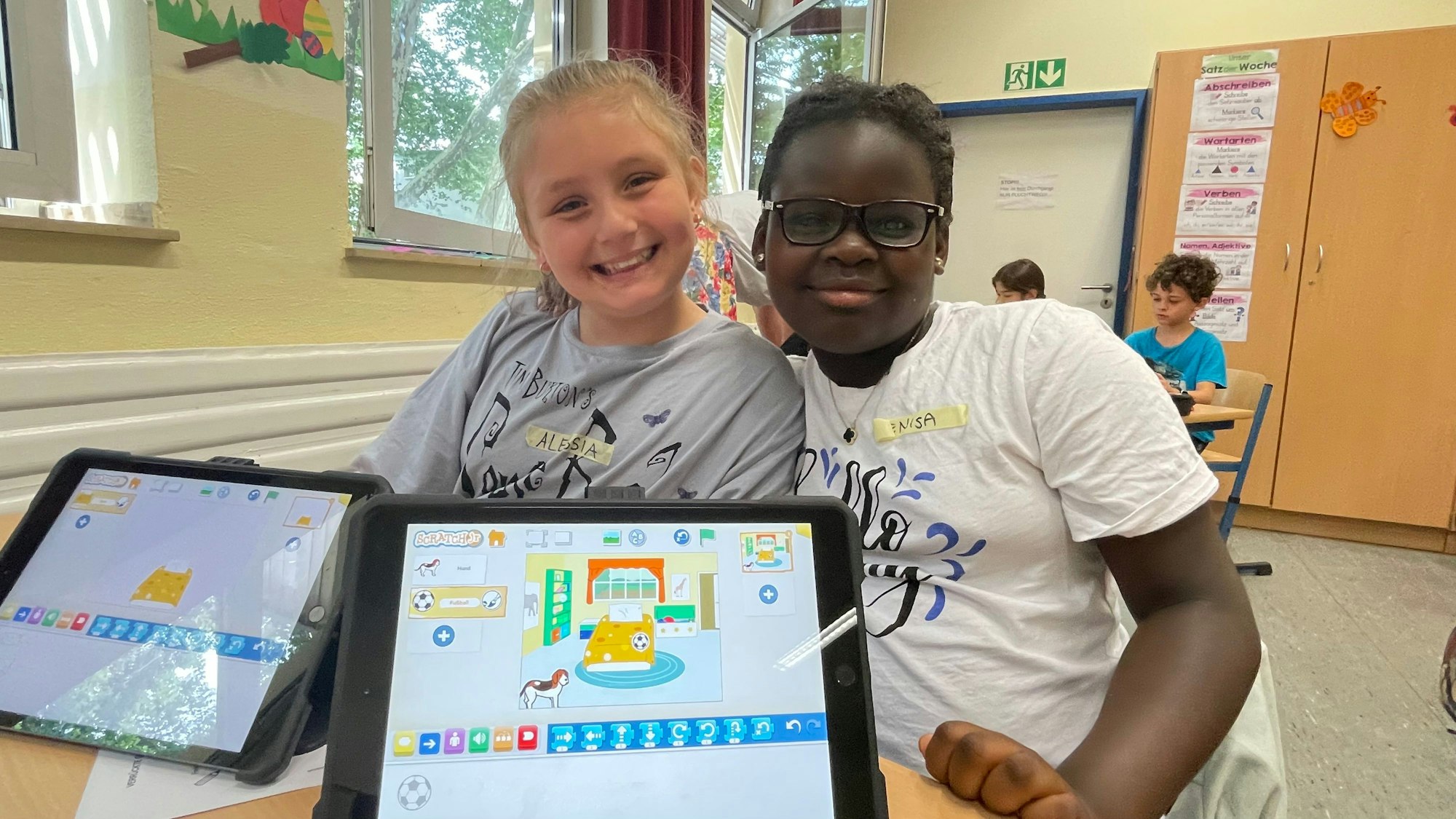 „Ich finde es sehr schön, dass ich mir eine Geschichte ausdenken und dann am Computer die Figuren lebendig werden lassen kann“, sagt Denisa, 8, und auch ihre Klassenkameradin Evelin hat Spaß: „Am liebsten würde ich das in jedem Fach machen, dann geht die Stunde schneller vorbei.“ Denisa und Evelin besuchen die dritte Klasse der GGS-Rosenzweigschule in Zollstock und sind begeistert. Denn heute Vormittag stehen ausnahmsweise Programmierer auf dem Stundenplan.