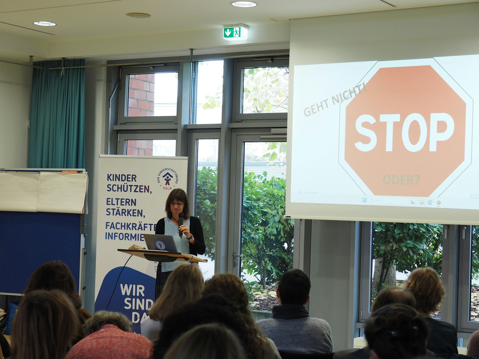Regine Umbach vom Kompetenzzentrum Kinderschutz hält einen Impulsvortrag beim Fachtag des Kölner Kinderschutzbunds.