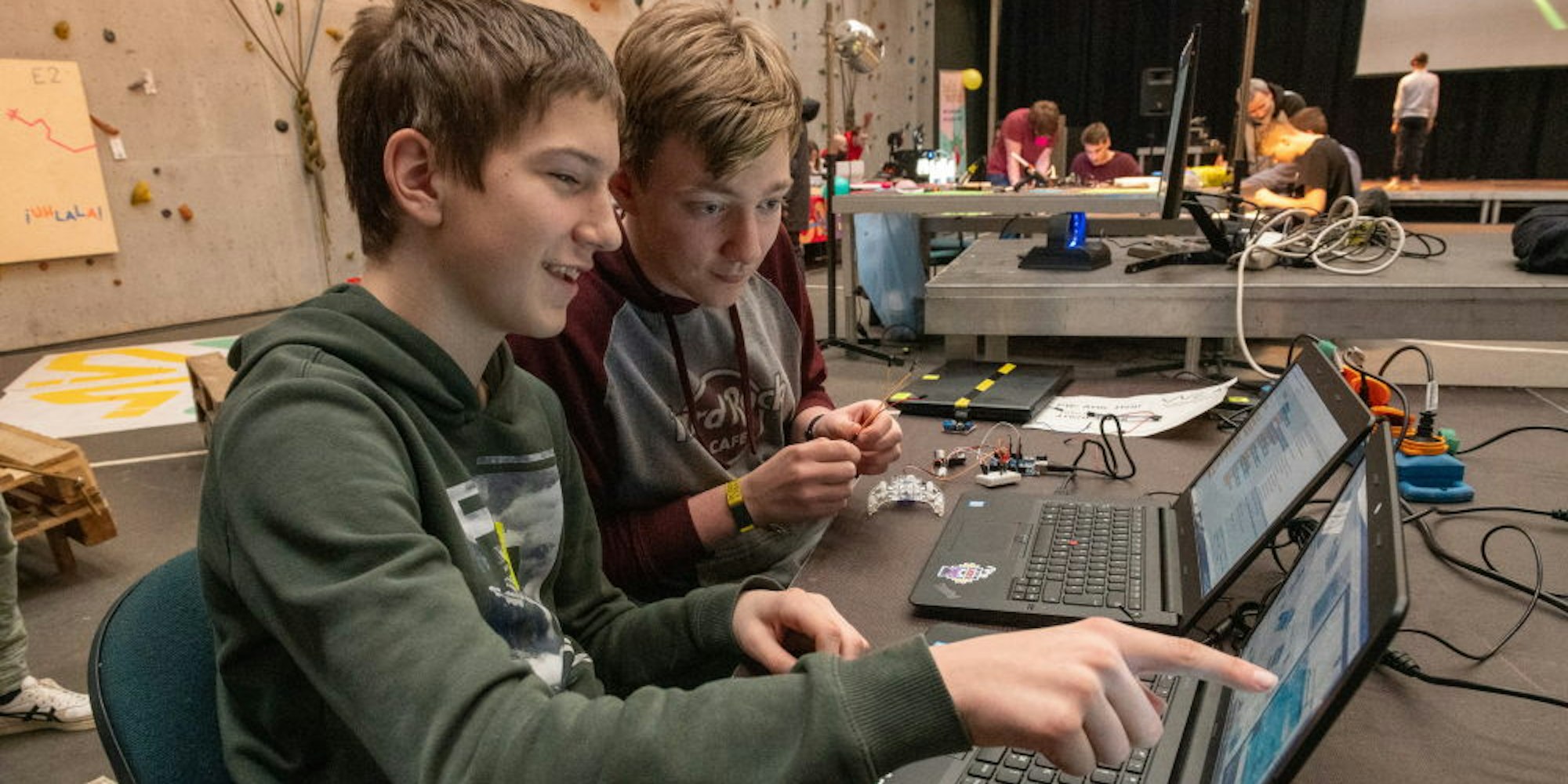 Auch Kreativität wird gefördert: Im oberen Stock der Kletterhalle werden in einem Raum Beats – Rhythmen – aus einem spanischen Gitarrenstück am Computer geschnitten und neu zusammengemischt. Wer möchte, kann ein selbst geschriebenes Lied rappen. „Heute Nacht haben wir an den Texten gearbeitet“, erzählt ein Teilnehmer. Eine Tür weiter lassen sich vor dem Green-Screen Filmszenen drehen. Die Ergebnisse sind am Samstag noch in Arbeit. Aber darum geht es ja: ums Machen.