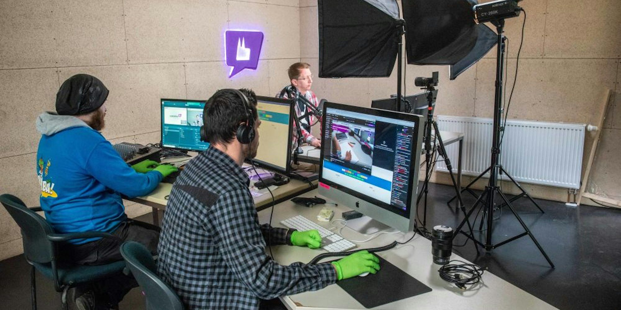 Vor dem Dom-Logo sendet Christian Schons live, die Kollegen überwachen die Technik.