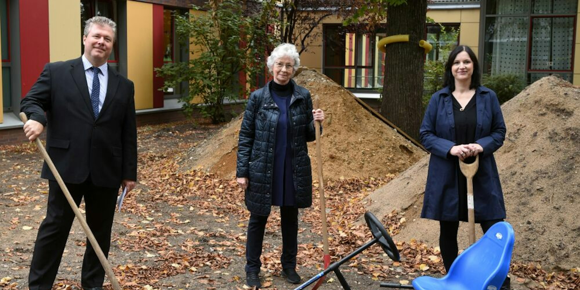 Chefarzt Stephan Bender, „wir helfen“-Vorsitzende Hedwig Neven DuMont und Schulleiterin Ellen Westphal beim symbolischen Spatenstich für das neue Außengelände