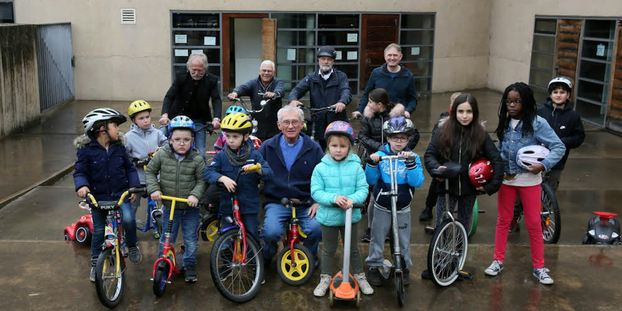 Die Präsentation des neuen Leselaufs fand in der Vingster Kirche St. Theodor statt. Vorne Pfarrer Franz Meurer mit Kindern, dahinter Henning Krautmacher (v.l.), Manfred Brodeßer (2.v.r) und Oliver Gritz (r.) vom Verein „Run and Ride for Reading“