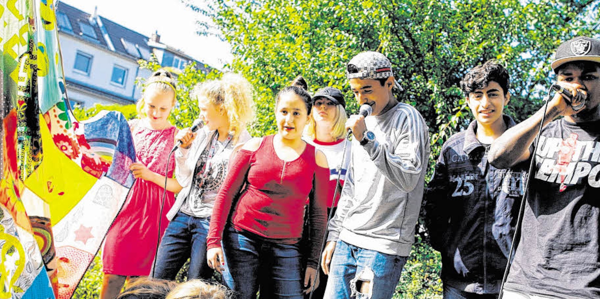 Köln – Aus den Kellerfenstern des Backsteinhauses an der Buchheimer Guilleaumestraße 16 wabern Hip-Hop-Rhythmen in den Hof, auf dem Michelle (13) und Isabell (11) an einem großen Holztisch sitzen – ihre Köpfe tief über einen Block Papier gesenkt. Der Text für ihren dritten Song entsteht in diesen Minuten, nur wenige Zeilen fehlen noch. Das letzte Gemeinschaftswerk, „Hör genau zu“, ist ein Reggae-Stück – und ein Liebesbeweis an die Musik. „Wir singen jeden Tag, brauchen dafür keinen Plattenvertrag“, singen Michelle und Isabell im Wechsel – „Nur mit Musik ist das Leben wirklich geil.“