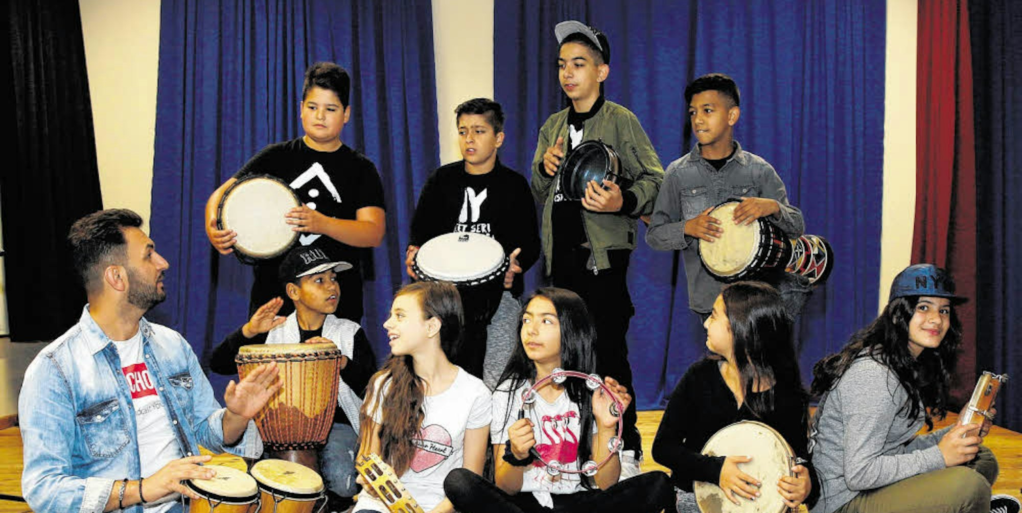 Trommelgruppe mit Enis Ibraimi (li.) vom Projekt „Amen Ushta“ in der offenen Ganztagsschule KGS Langemaß in Mülheim