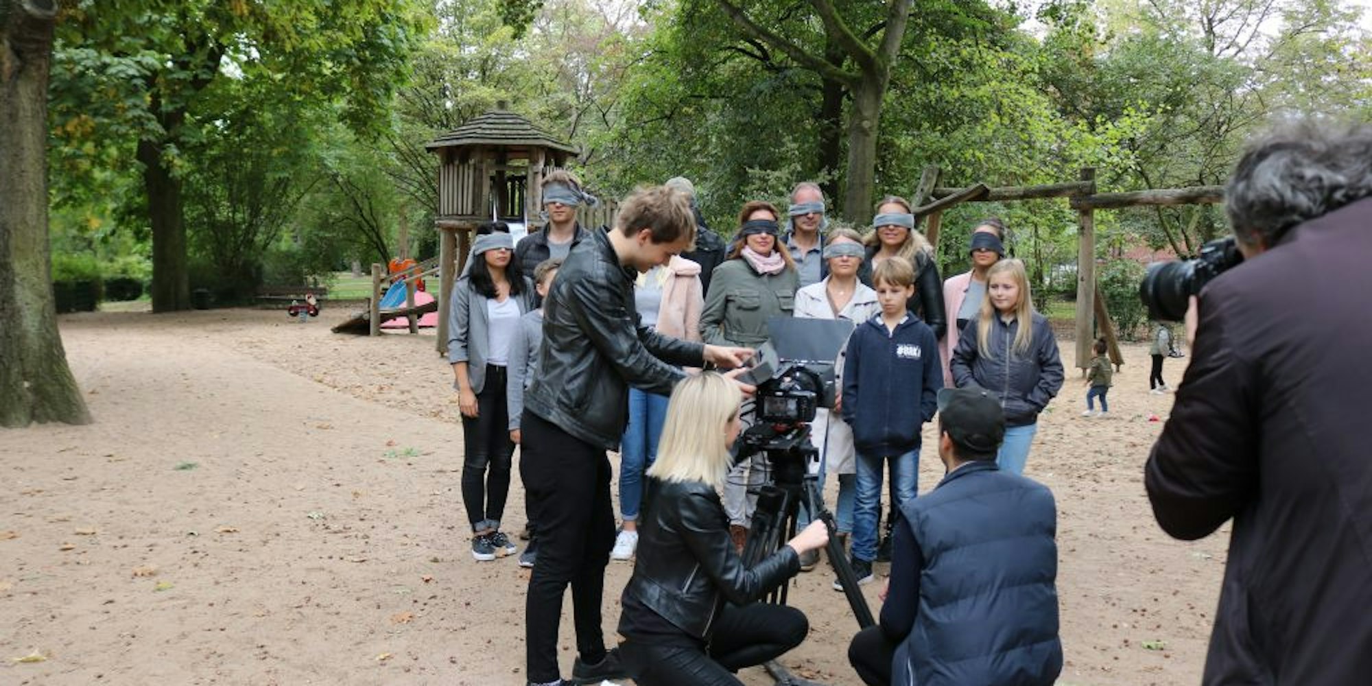 Das Team drehte einen Teil des Trailers auf einem Spielplatz in der Nähe des Wiener Platzes in Köln-Mülheim. Die Erwachsenen tragen Augenbinden als Symbol dafür, dass immer noch zu viele Menschen beim Thema sexuelle Gewalt nicht genügend hinsehen.