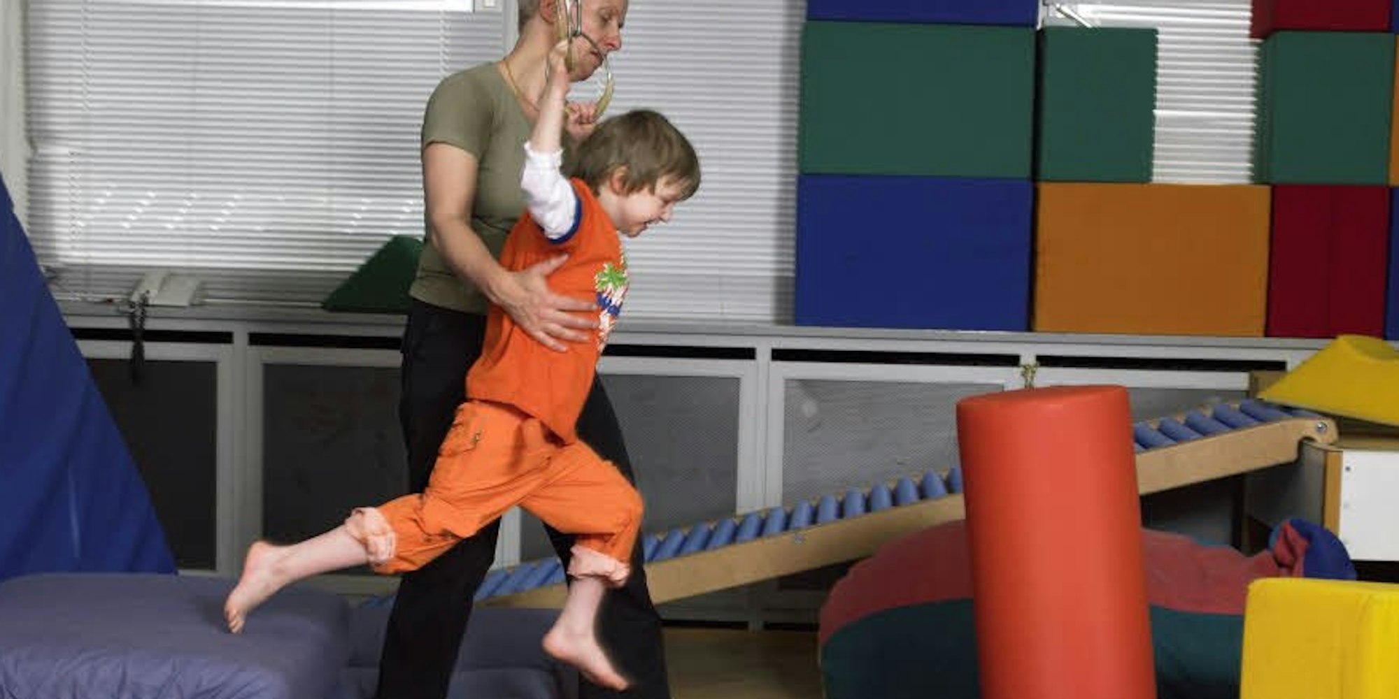 In der Ergotherapie des Zentrums für Frühförderung und Frühbehandlung entdeckt ein Kind seine körperlichen Fähigkeiten.