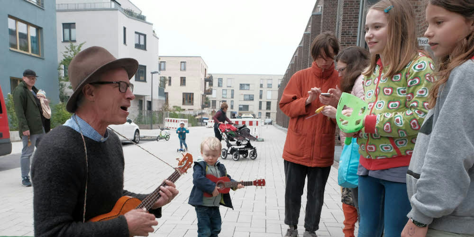 Heute, an einem trüben Montag im Mai, fast auf den Tag genau ein Jahr nach der offiziellen Eröffnung des Luftschiffs, sitzt Horstkotte mit seiner Ukulele auf dem grünen, runden Teppich vor seinem wahr gewordenen Traum am Luftschiffplatz 5 und singt mit der versammelten Kinder-Schar „Meine Biber haben Fieber.“ Sein Stellvertreter Marcel Marx betreut das sportliche Programm: Kicken und Klettern. Und Ehefrau und künstlerische Leiterin Eva Löffelholz ist für den kreativen Part zuständig: Stempeln und Malen im Innenhof.