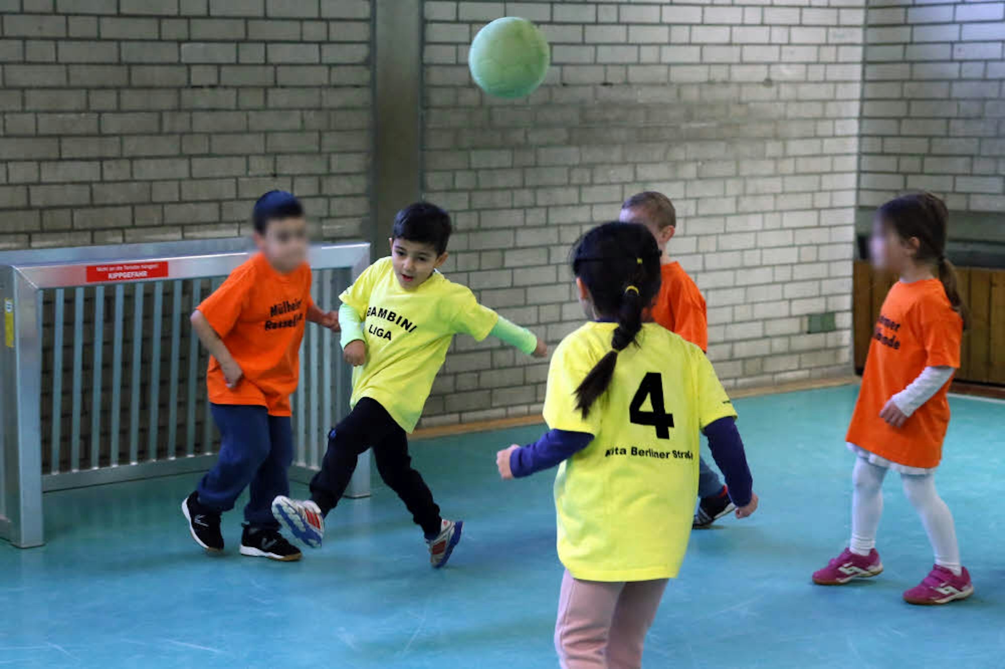 Im Vorraum der Turnhalle herrscht quirliges Gewusel. Endlich dürfen die ersten beiden Mannschaften auf den Platz. Angefeuert von ihren Erzieherinnen und Erziehern rennen die insgesamt zwölf Jungen und Mädchen vom Familienzentrum der Christlichen Sozialhilfe („Rasselbande“) und der städtischen Kita Berliner Straße hinter dem Ball her. Noch sieht es ein wenig wie Rudelbildung aus, doch immer wieder blitzt auch schon großes fußballerisches Können auf. Etwa als Eyyüb (5) die Kita Berliner Straße mit einem beherzten Schuss in Führung bringt. Mit einem Strahlen im Gesicht läuft der Vorschuljunge auf seine Erzieherinnen zu und lässt sich abklatschen.