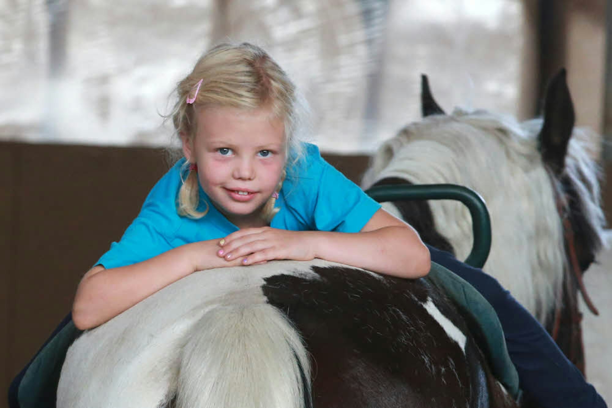Ida ist drei Jahre alt, ein kleiner Sonnenschein mit langen blonden Zöpfen und hat ein Down-Syndrom. Das Mädchen verfügt über einen schwächeren Muskelapparat im Vergleich zu anderen Kindern, der es ihr erschwert, den Mund zu schließen, was zum Beispiel zu Sprechproblemen führen kann. Der Ausflug mit „Sopresa Grande“, der einmal in der Woche stattfindet, wirkt wie Medizin auf das Kind. Durch die schaukelnden Bewegungen des Pferdes werden der Gleichgewichtssinn, die Körperhaltung und die Muskulatur gestärkt, sagt Lisa Tepass vom Verein Therap. Idas Schwester Mathilda (7) kommt regelmäßig mit zur Reitstunde, weil Reiten auch ohne therapeutischen Ansatz schließlich viel Spaß macht.