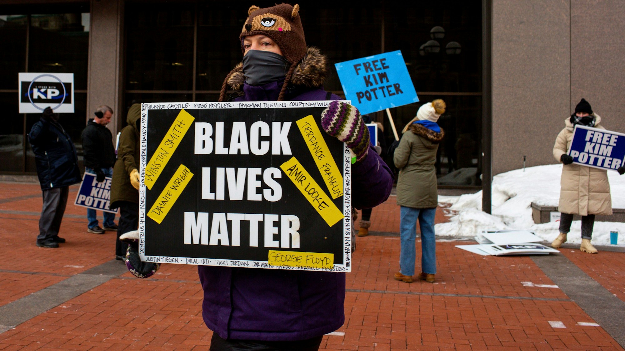 Minneapolis: Ein Demonstrant hält im Februar 2022 ein „Black Lives Matter“-Schild, um die Freilassung von Kim Potter zu fordern.