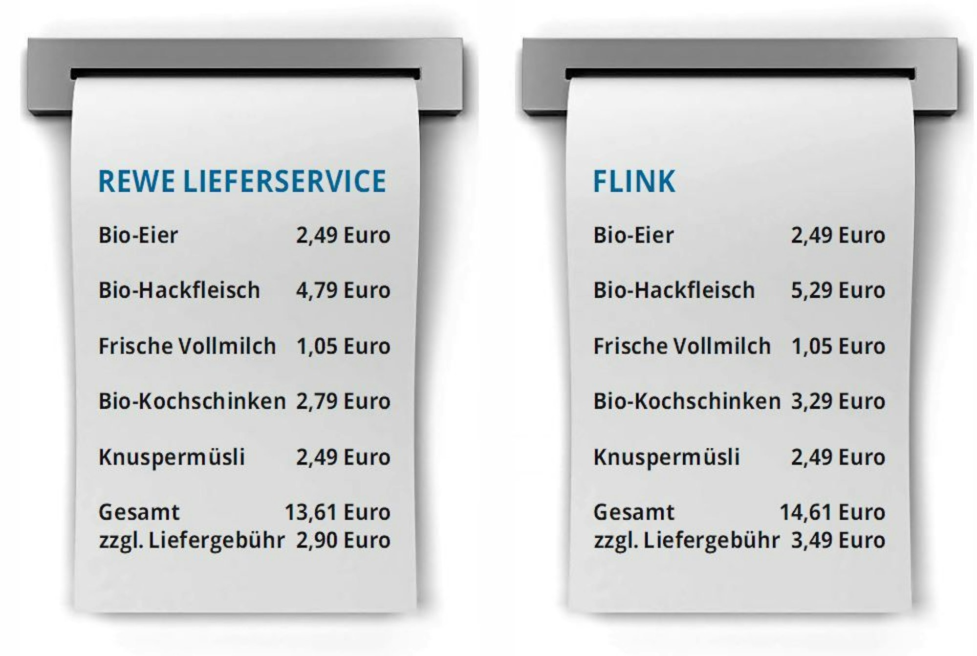Die Rewe Group hat schon mehrfach in Flink investiert, zuletzt 150 Millionen Euro im Sommer 2023. Zum Jahresende war sie mit 11,9 Prozent an Flink beteiligt. Obwohl Rewe mit Lieferando kooperiert, liefert eigentlich Flink die Bestellung aus: Die Ware kommt nicht aus den Rewe-Filialen, sondern aus Expresslagern von Flink - in Köln etwa in der Nähe des Stadtgartens. Wer seinen Rewe-Einkauf bei Flink bestellt, muss 14,31 Euro berappen, also einen Euro mehr als bei Rewe direkt. Hinzu kommt eine Liefergebühr von bis zu 3,49 Euro.