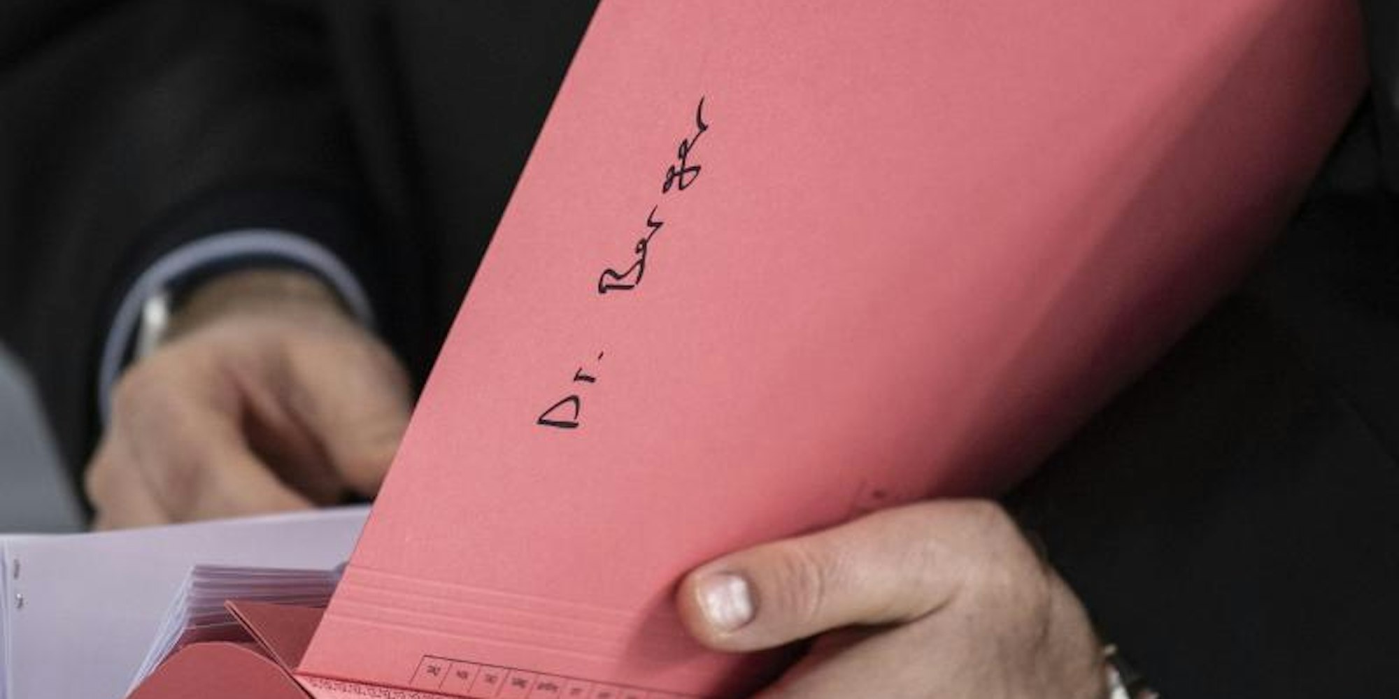 Ein Rechtsanwalt des Hauptbeschuldigten Hanno Berger mit eine Akte mit der Aufschrift „Dr. Berger”.
