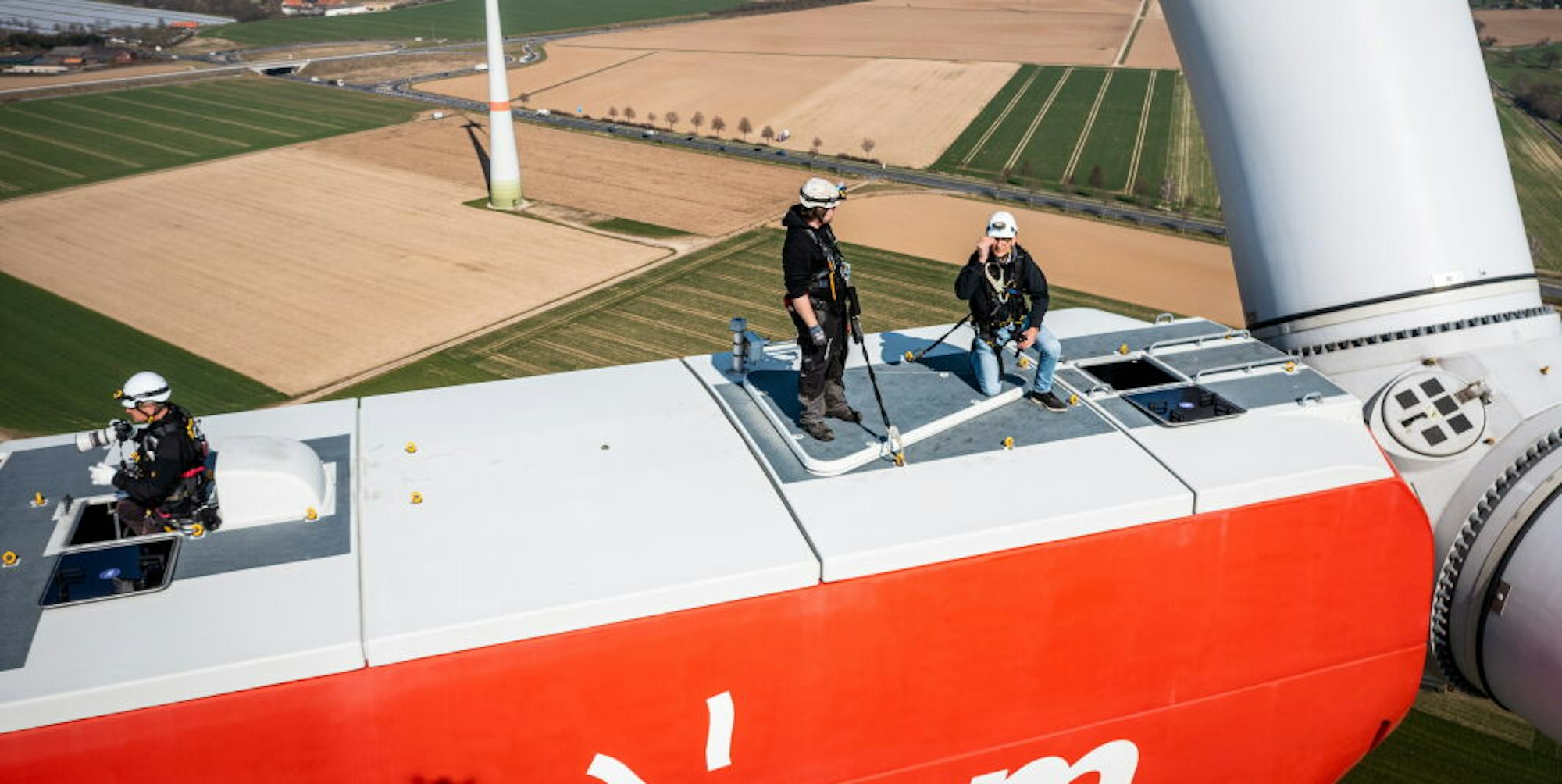 Die Wartungsteams arbeiten grundsätzlich mindestens zu zweit. Allein fährt keiner an die Spitze eines Windrads. „Im Notfall müssen wir uns gegenseitig helfen können“, sagt Granderath. „Es kann ja mal passieren, dass wir uns außen in einem Korb runterlassen müssen.“ Alle Rettungsgeräte haben Seillängen von 160 Metern.