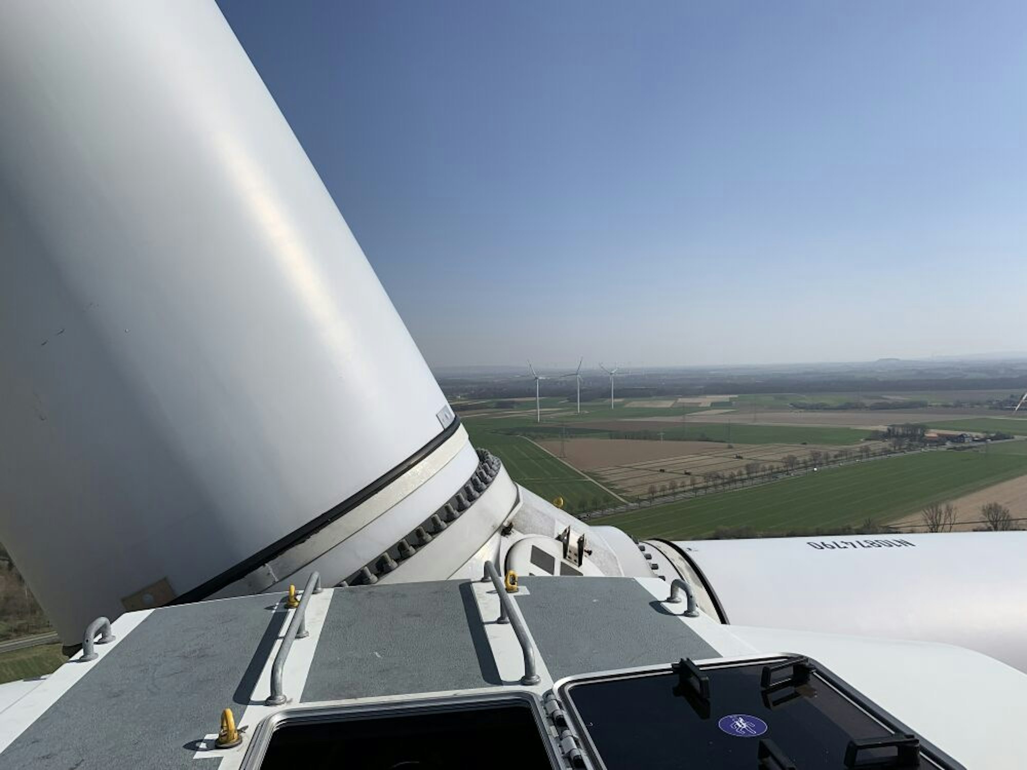 Die letzten Meter bis zur Gondel müssen wir uns über Leitern vorbei an Schaltkästen und dem Generator zwängen. Auf dem Dach angekommen, beantworten sich viele Fragen von selbst. Nein, die Rotorblätter der vielen Nachbarn von NX 85495 sind nicht laut. Der Verkehr auf der Bundesstraße unter uns ist deutlich zu hören.