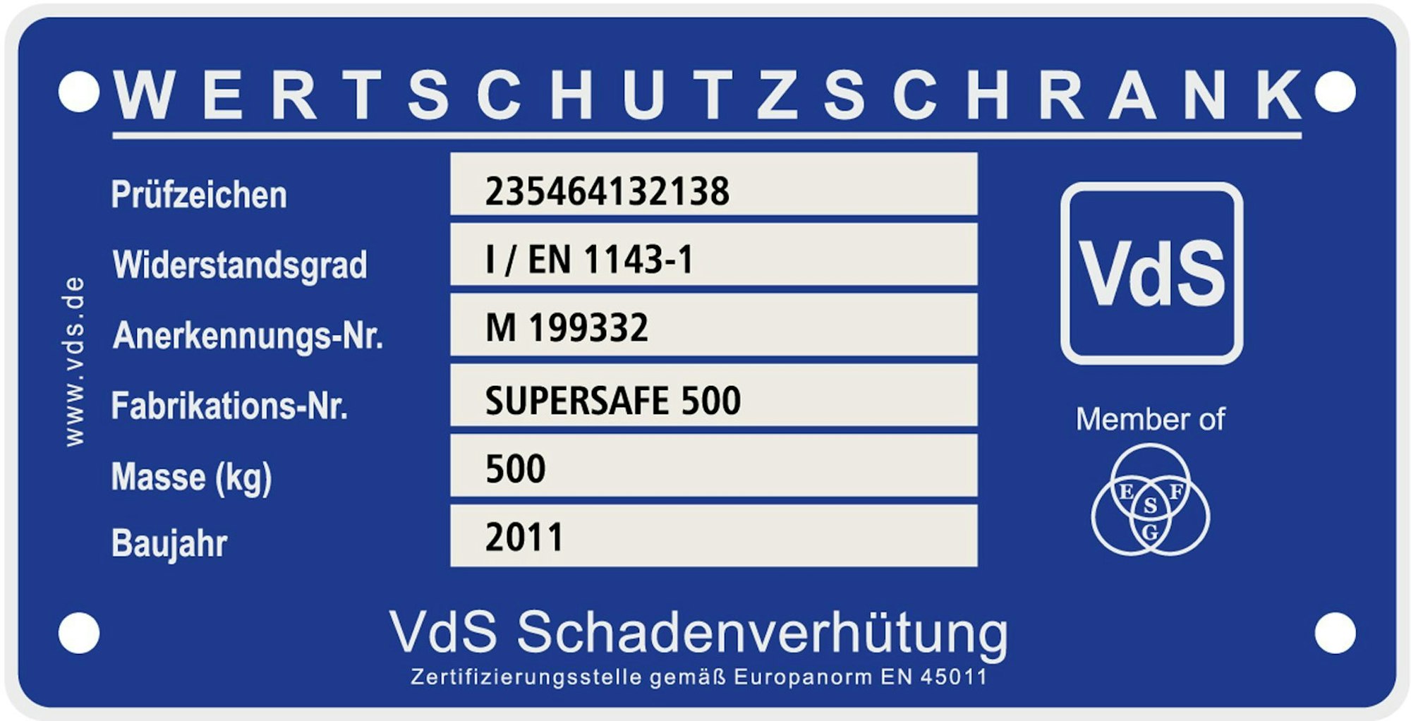 Angaben zum Gewicht und zur Zertifizierung geben zum Beispiel solche Plaketten der VdS-Schadenverhütung.