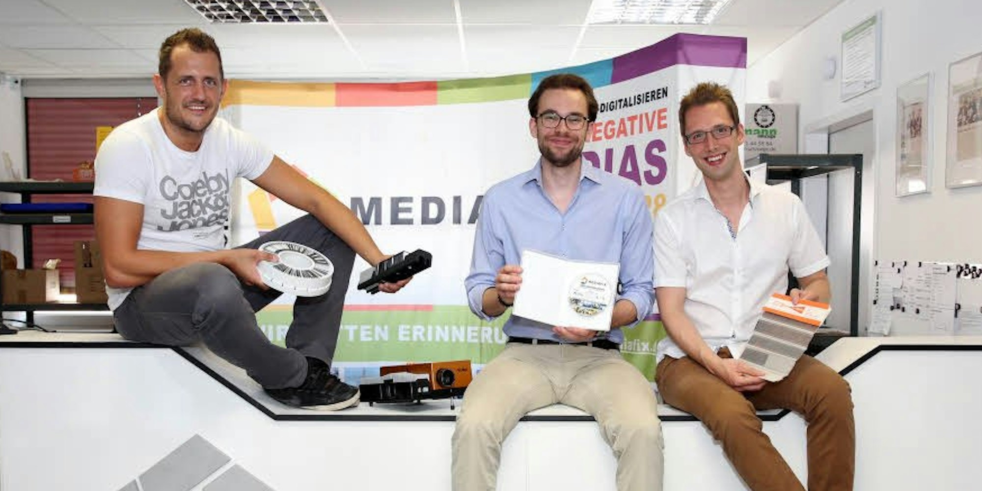 „Für unsere Kunden haben ihre Fotos und Filme einen großen emotionalen Wert“, sagt Stefan Wickler, der sich um Vertrieb und Produktion kümmert. Aber: Ewig haltbar sind die Aufnahmen nicht, mit der Zeit verblassen sie und können schimmeln. „Um die Digitalisierung seiner Fotos kommt auf Dauer niemand herum“, meint Herrmann. Bei Mediafix ist er zuständig für Marketing und Finanzen, die Firma ist sein drittes Start-up. Auch Wickler und Kind sammelten schon vor Mediafix Erfahrungen als Selbstständige. Über das Gründer- und Innovationszentrum im Kölner Technologiepark fanden sie zusammen.