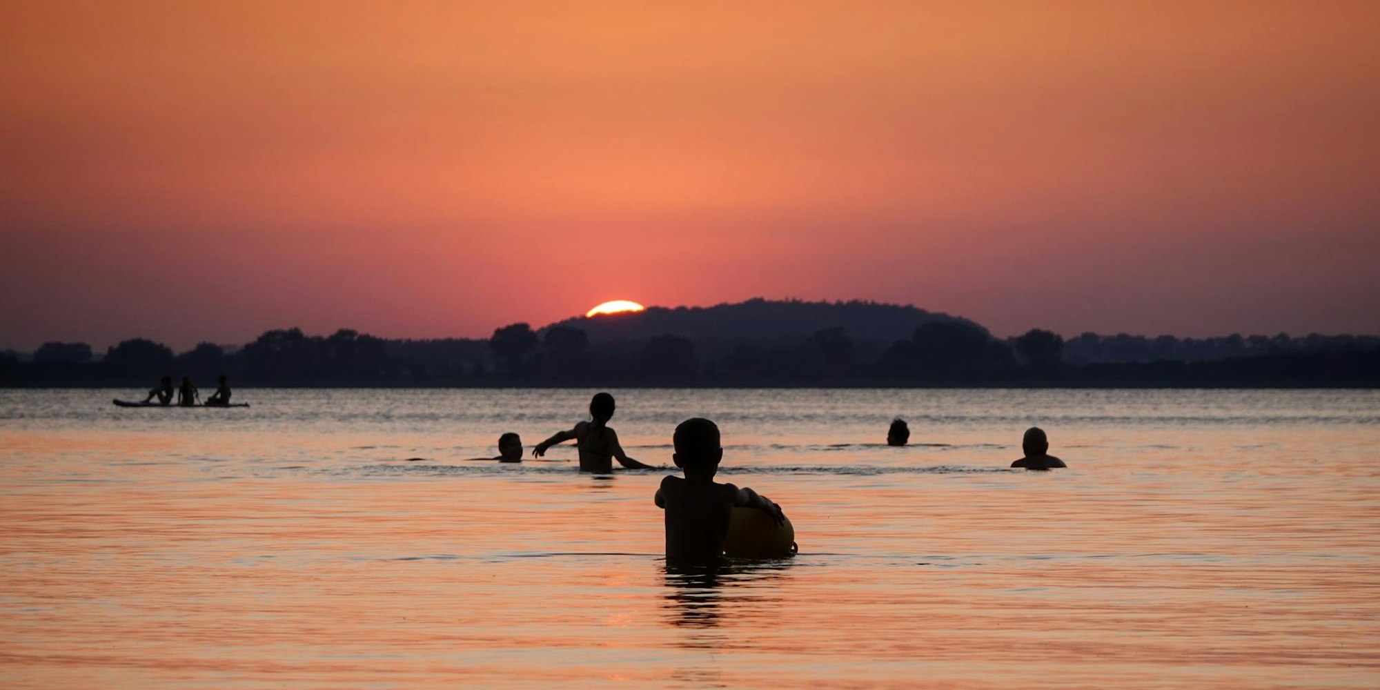 Kinder beobachten den Sonnenuntergang im Achterwasser der Insel Usedom.