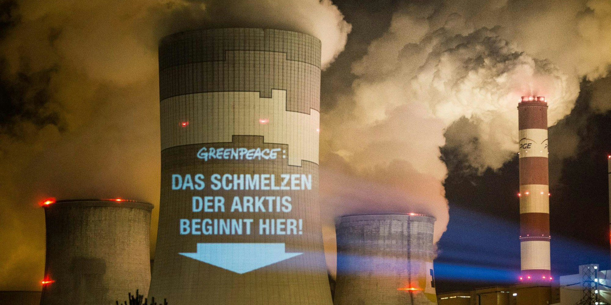 Kohlekraftwerk im polnischen Belchatow mit Projektion der Umweltorganisation Greenpeace