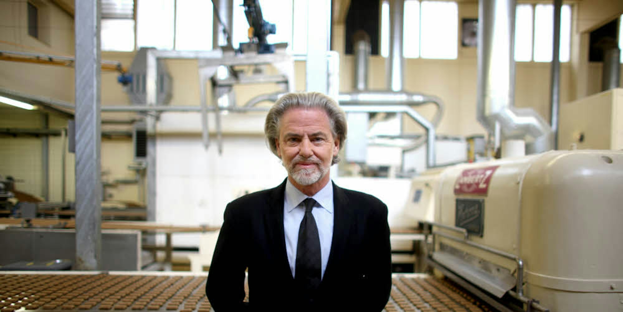 Hermann Bühlbecker, Inhaber der Lambertz-Gruppe aus Aachen, vor einer Gebäckmaschine.
