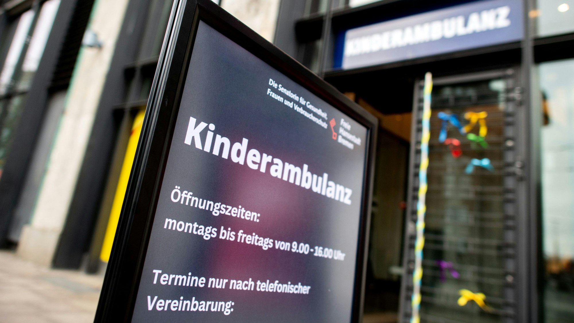 Ein Schild mit der Aufschrift ·Kinderambulanz· steht vor dem Gebäude einer Kinderambulanz.(Symbolbild)