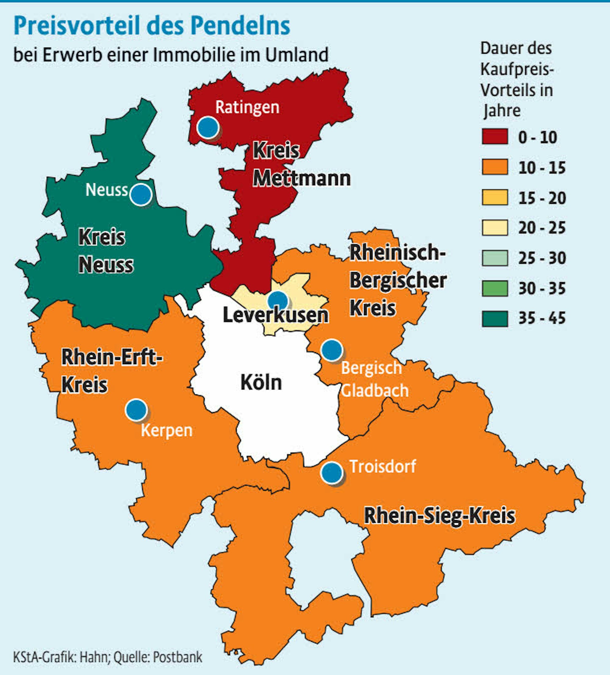 „Unsere Modellrechnung kann selbstverständlich lediglich Anhaltspunkte liefern“, sagt Stefan Konersmann, Filialgebietsleiter bei der Postbank in Köln. Denn das Ergebnis hänge natürlich davon ab, wo genau im Umland das Eigenheim stehe, wie die Anbindung nach Köln sei und an exakt welchem Punkt dort die Arbeitsstelle liege. Entscheidend sei auch, ob in einem Haushalt ein oder zwei Arbeitnehmer pendeln, und wie die Karriereplanung generell aussehe.