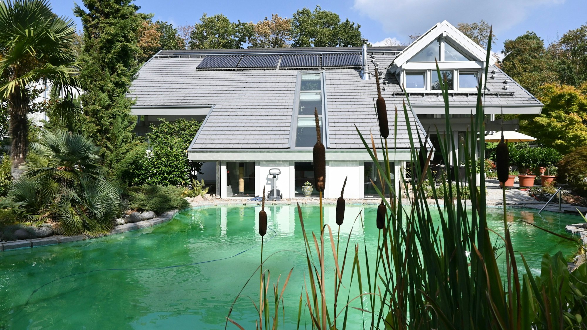 Bei der Ausstattung fallen die Sauna und das Heimkino auf, besonders aber die weite Außenanlage. Dort gibt es zum Beispiel einen eigenen Obstgarten sowie reichlich Wasser. Auf dem Dach ist eine Photovoltaik-Anlage installiert, zusätzlich mehrere Solarthermie-Paneele. Der Kaufpreis liegt laut Exposé bei 2,4 Millionen Euro. Zur Villa gehört außerdem eine Einliegerwohnung.