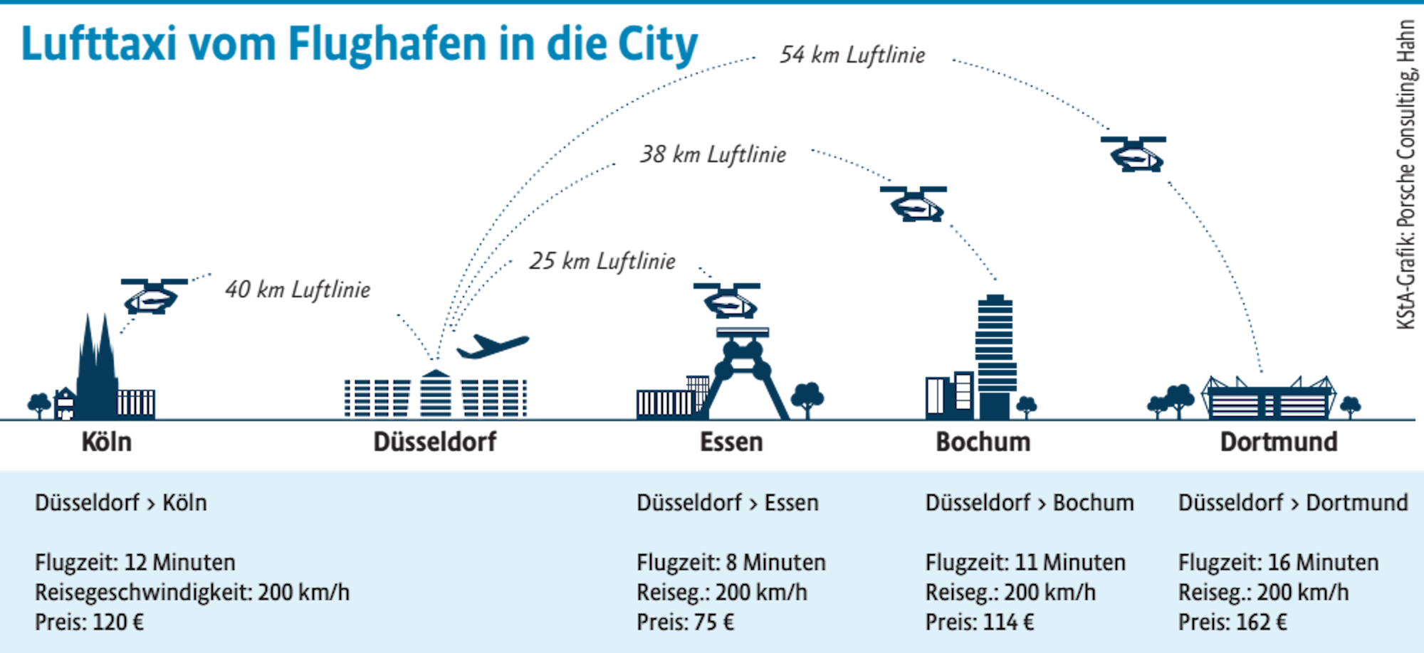 Köln – In nur zwölf Minuten soll man in einigen Jahren vom Düsseldorfer Flughafen nach Köln reisen können – mit Lufttaxis. Die neue Verkehrsverbindung ist Teil der Zukunftsvision, die eine Studie der Managementberatung Porsche Consulting entwirft.