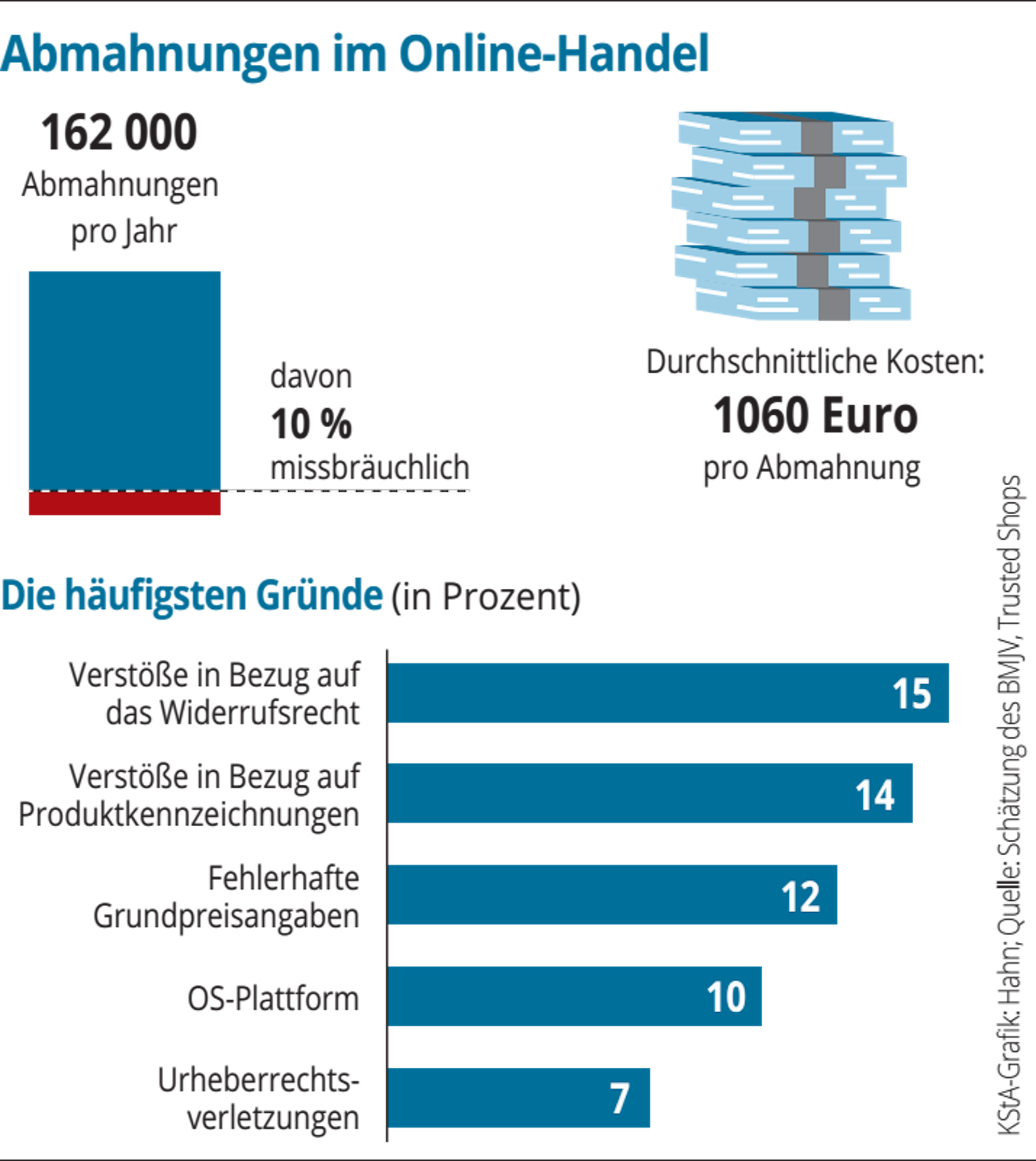 Laut einer Schätzung des Bundesministeriums für Justiz gibt es jährlich etwa 162.000 wettbewerbsrechtliche Abmahnungen. Eine nicht-repräsentative Umfrage des E-Commerce-Dienstleisters Trusted Shops nennt als häufigste Gründe für eine Abmahnung Verstöße in Bezug auf das Widerrufsrecht (15 Prozent), Verstöße in Bezug auf Produktkennzeichnungen (14 Prozent) und fehlerhafte Grundpreisangaben (12 Prozent). Laut Justizministerium belaufen sich die durchschnittlichen Kosten pro Abmahnung auf etwa 1060 Euro. Rund zehn Prozent der Abmahnungen seien „missbräuchlich“.