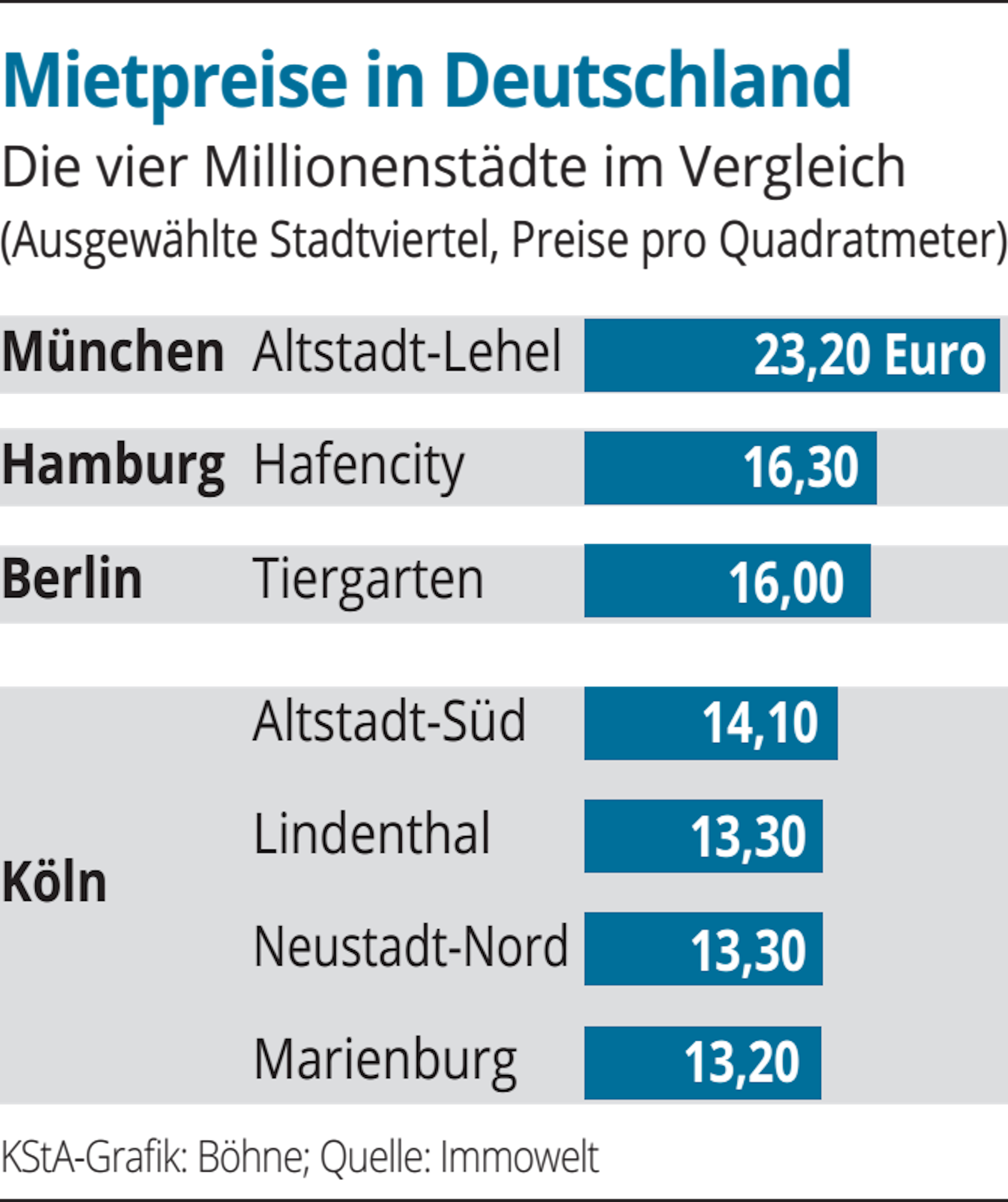 Tatsächlich werden die Kölner Mieten deutlich von denen der Topviertel in München, Hamburg und Berlin übertroffen. Eine Mietwohnung in Münchens teuerstem Viertel Altstadt-Lehel kostet mit 23,20 Euro pro Quadratmeter rund neun Euro mehr als eine in der Altstadt-Süd. Immowelt begründet die hohen Preise dort mit der Kombination aus Naherholung und Zentrumslage rund um den Marienplatz und den Englischen Garten. Von Münchens Top-5-Vierteln kommt allerdings auch ganz generell keines auf einen durchschnittlichen Quadratmeterpreis von unter 21 Euro.