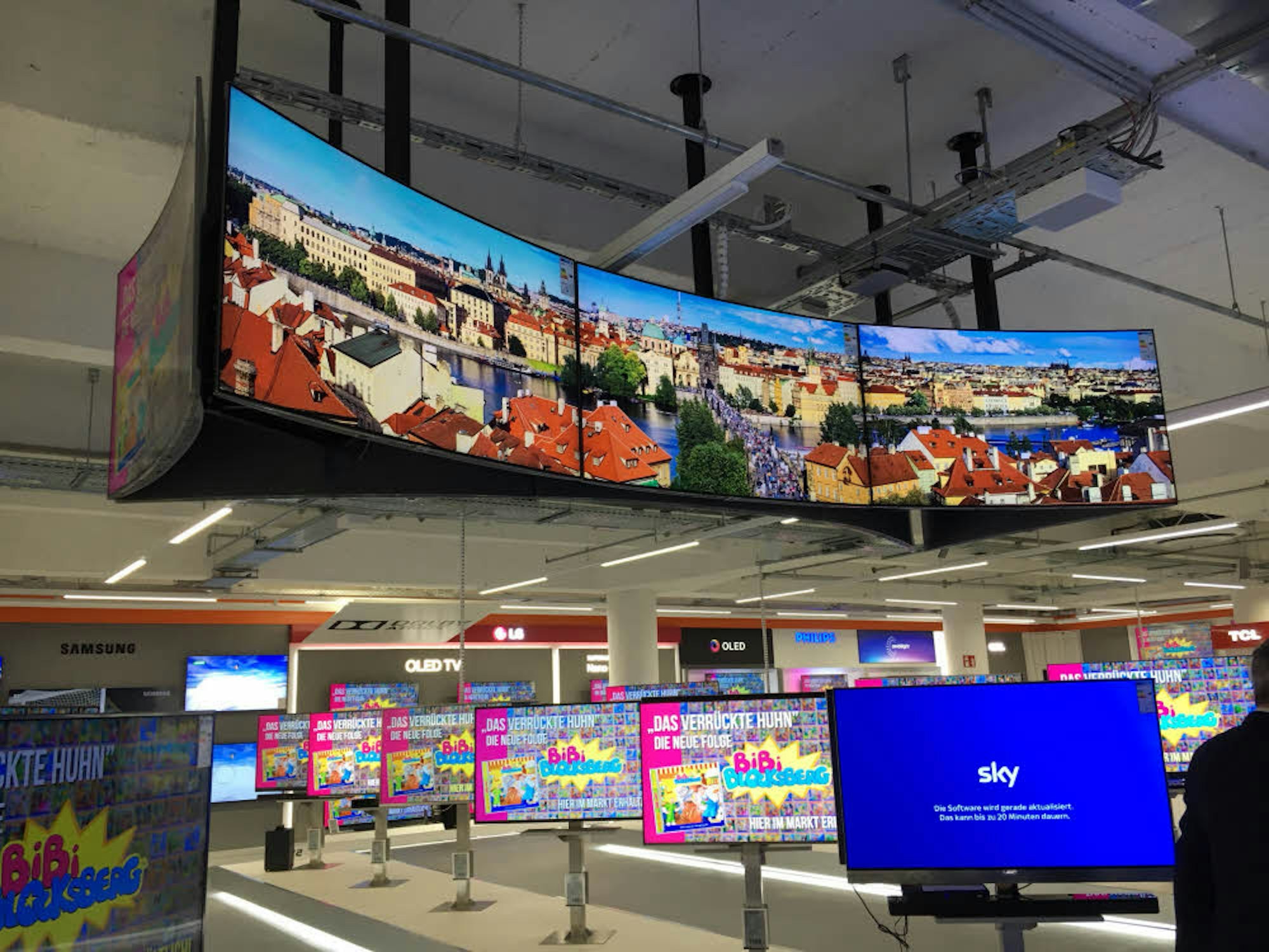 Auf fünf Etagen und rund 6.500 Quadratmetern Verkaufsfläche bietet der Elektronikriese verschiedene Themenwelten und Verkaufshöhepunkte. Bereits den Eingang betritt man über einen 21 Quadratmeter großen Bereich, der mit LED-Effekten in den Boden eingelassen ist. Direkt daneben grüßt Roboter Pepper und spielt den Lieblingssong und in der Videospiel-Abteilung wartet die Virtual-Reality-Brille zum Test.