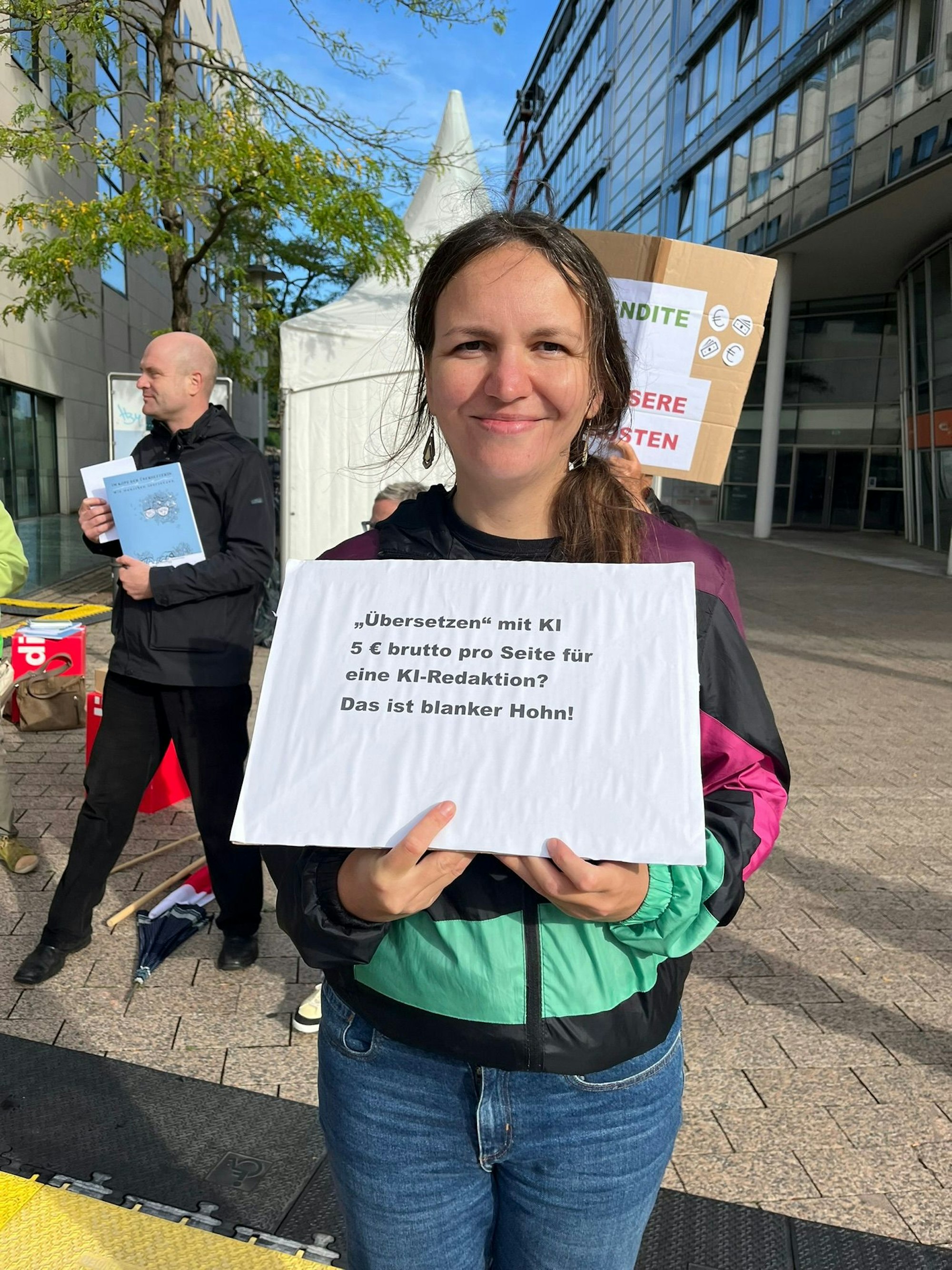 Übersetzerin Janine Malz ist aus München angereist. Sie hatte sich schon vor einem Monat öffentlich auf dem Karrierenetzwerk Linkedin zu den niedrigen Honoraren geäußert. Damals hatte sie eine Anfrage einer Bastei-Lübbe-Lektorin veröffentlicht, die sie für die Redaktion einer KI-Übersetzung angefragt hatte. Es ging um eine vierteilige Romanreihe aus den Niederlanden, die als E-Book erscheinen sollte. Fünf Euro pro Seite sollte sie dafür bekommen, ein übliches Übersetzungshonorar liegt bei rund 20 Euro. „Ich sollte auch keinen Übersetzungsvertrag erhalten, sondern nur einen Redaktionsvertrag. Mir fiel die Kinnlade herunter“, sagt Malz. „Diese scheinbar harmlose Anfrage bedeutet nichts weniger als den Anfang vom Ende meines Berufs.“