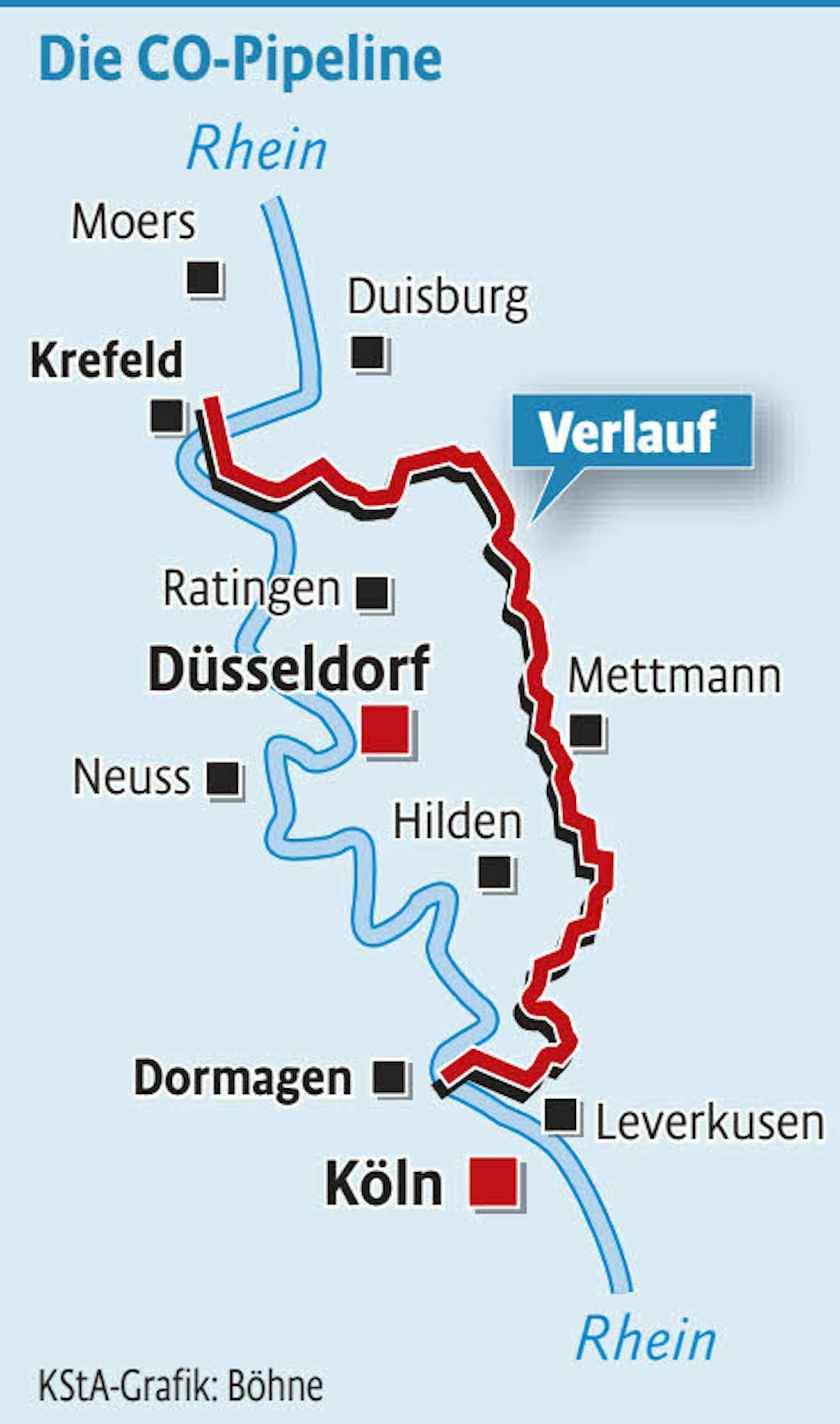 Covestro, einer der größten Kunststoffhersteller weltweit, will Kohlenmonoxid vom Werk in Dormagen zur Fabrik in Krefeld transportieren, weil es dort gebraucht wird. „Nur so können wir auf Dauer die Produktion garantieren“, sagt Sprecher Jochen Kluener. Bisher muss das Kohlenmonoxid in Krefeld eigens hergestellt werden. Das sei ein erheblicher Kostenfaktor. „In Dormagen fällt es als Nebenprodukt an“, so der Sprecher.