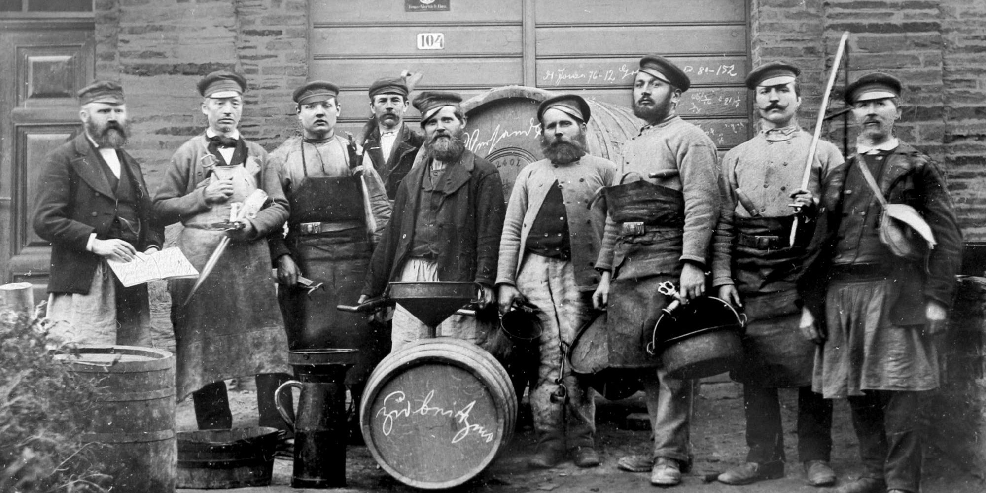 Neun Mitglieder der jetzt 150 Jahre alten Winzergenossenschaft in Mayschoß-Altenahr stehen auf diesem historischen Foto in ihrem Hof.
